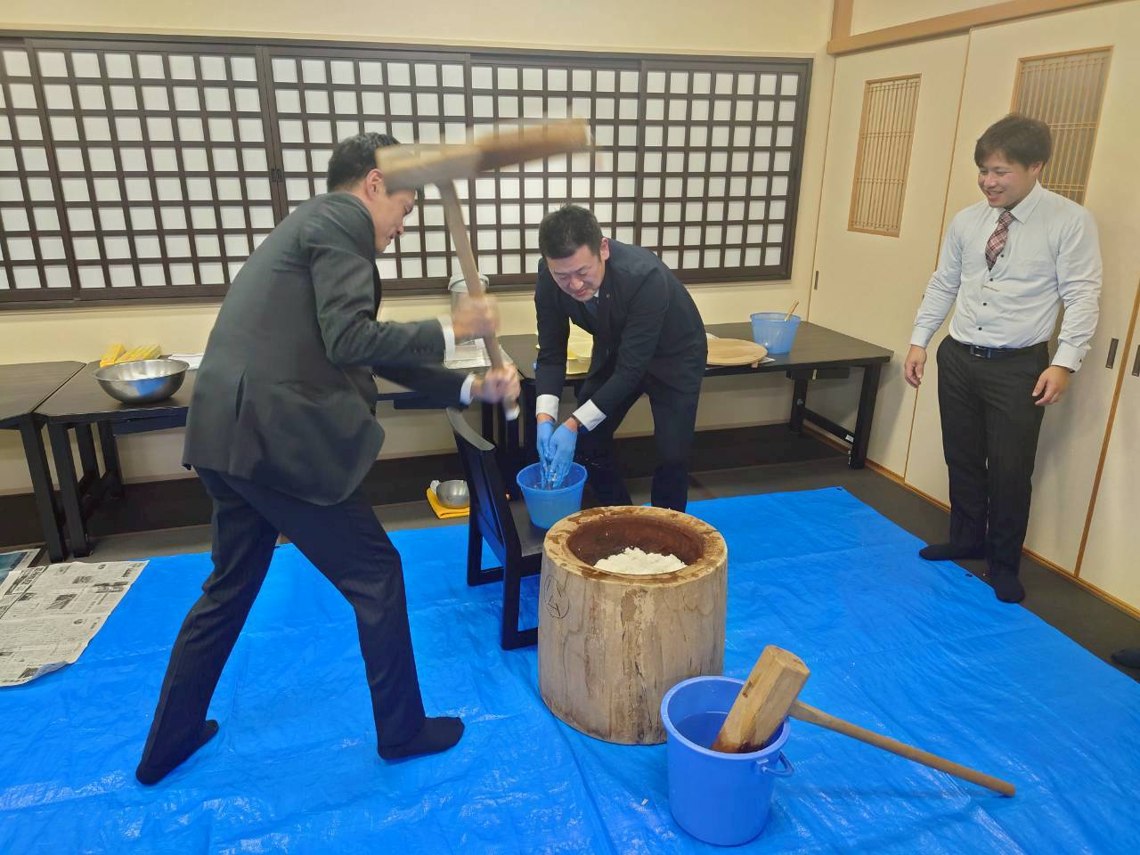 また新年会では、宮津商工会議所より今井会頭、山口専務理事を来賓としてお迎えし、アトラクションとして2月22日㈰に控える70周年事業へ向け、会員一同の結束を深める目的として餅つきをしました。